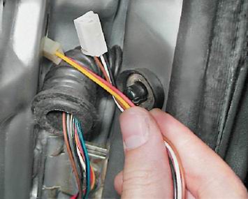8. Через отверстие в торце двери извлекаем провода вместе с колодками.