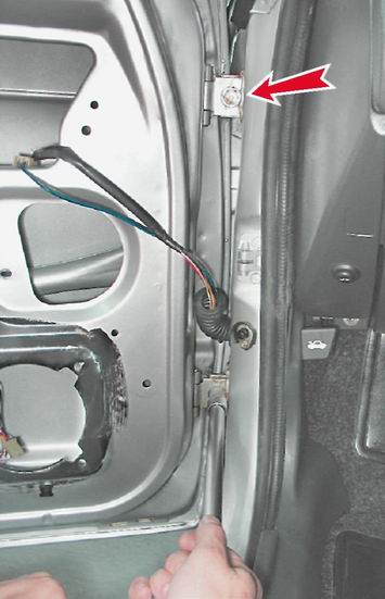 Предупреждение! При выполнении следующей операции помощник должен поддерживать дверь. 9. Торцовым ключом на 13 мм отворачиваем два болта крепления двери (по одному на каждой петле) и снимаем дверь с автомобиля.
