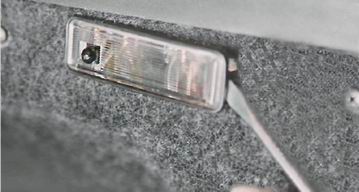6. Заводим выступ на задней части плафона за кромку отверстия в обивке и, надавив на переднюю часть плафона, фиксируем плафон на своем месте.