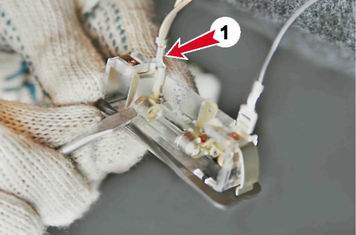 При необходимости снять плафон отсоединяем от его выводов два провода. Наконечник "плюсового" провода (1), необходимо заизолировать, чтобы исключить возможность короткого замыкания при включении освещения 4. Шлицевой отверткой отжимаем пружинящий контакт и вынимаем неисправную лампу из плафона.