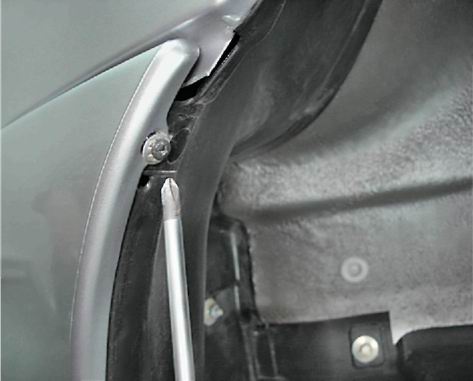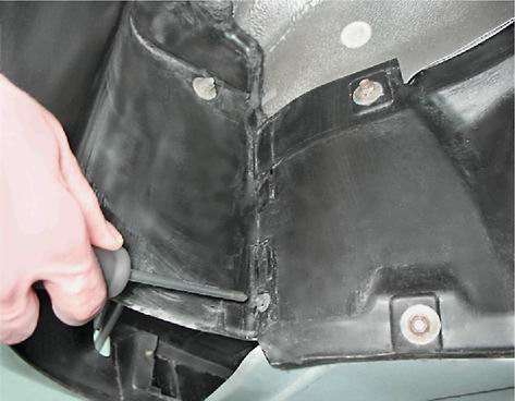 8. Выводим наружную кромку подкрылка из желоба арки крыла и снимаем подкрылок. Замечание. Саморезы крепления подкрылка заворачиваются в пружинные скобы. Не потеряйте их при извлечении подкрылка.
