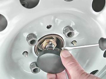 Подшипник ступицы заднего колеса - заменаДля выполнения работы потребуются: - трех и двухзахватные съемники; - сдвижные щипцы для снятия стопорных колец; - чашечный съемник. Снятие 1. Подготавливаем автомобиль к выполнению работы (см. "Подготовка автомобиля к техническому обслуживанию и ремонту"). 2. Поддев шлицевой отверткой снимаем крышку ступицы.