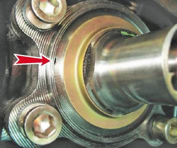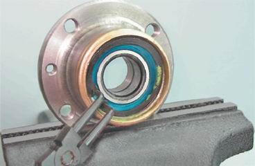 Установка Предупреждение! При запрессовке подшипника усилие можно прикладывать только к его наружному кольцу 1. Используя наружное кольцо старого подшипника как оправку, съемником запрессовываем в ступицу новый подшипник.