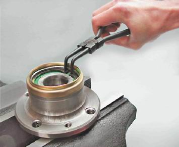 9. Устанавливаем ступицу в тиски. 10. Специальными щипцами сжимаем и извлекаем стопорное кольцо подшипника.