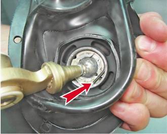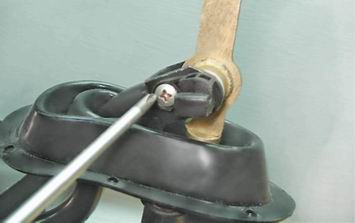 7. Поддев отверткой, снимаем с опоры чехол. Сборка Заменяем изношенные детали и собираем привод переключения передач в обратной последовательности. При установке рычага переключения передач смазываем его шаровой шарнир техническим вазелином.
