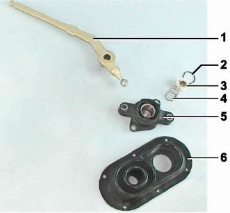 Детали шаровой опоры рычага переключения передач: 1 - рычаг переключения передач; 2 - стопорное кольцо; 3 - опора; 4 - пружина опоры; 5 - обойма опоры; 6 - чехол опоры |