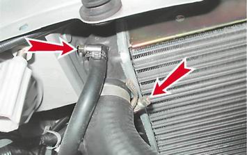 4. Ослабив затяжку хомута, снимаем с патрубка радиатора шланг отвода охлаждающей жидкости.