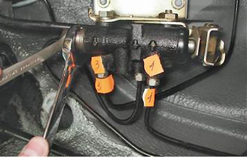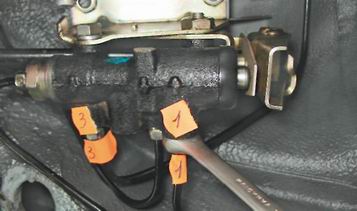 6. К регулятору подходят четыре тормозные трубки: две подводящие (от главного тормозного цилиндра) и две отводящие (к рабочим цилиндрам). На корпусе регулятора имеются рельефные стрелки, указывающие места подсоединения подводящих и отводящих трубок. Для облегчения сборки помечаем порядок подсоединения тормозных трубок к регулятору. 7. Специальным ключом ослабляем затяжку штуцера тормозной трубки, подходящей к регулятору давления с торца, удерживаем наконечник регулятора рожковым ключом на 21 мм.