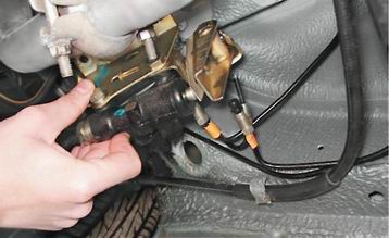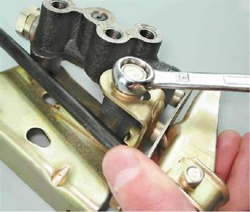 9. Окончательно отворачиваем штуцеры рожковым ключом того же размера. Предупреждение! При отсоединении трубок от регулятора следите за тем, чтобы трубки не вращались вместе со штуцерами. Если трубки "закисли" в штуцерах, замените их. 10. Торцовым ключом на 10 мм отворачиваем две гайки крепления кронштейна регулятора к кузову автомобиля.