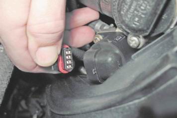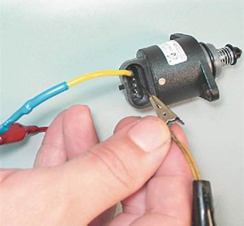 Регулятор холостого хода - проверка и заменаПредупреждение! Перед выполнением работы ознакомьтесь с мерами предосторожности при ремонте системы управления двигателем (см. "Меры предосторожности при ремонте системы управления двигателем"). Для выполнения работы потребуются: - мультиметр (в режиме вольтметра и омметра); - отрезки проводов. Проверка 1. Подготавливаем автомобиль к выполнению работы (см. "Подготовка автомобиля к техническому обслуживанию и ремонту"). 2. Освобождаем фиксатор и отсоединяем колодку жгута проводов от регулятора холостого хода.