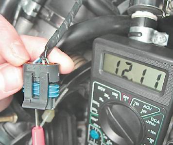 3. Подсоединяем "минусовый" щуп вольтметра к "массе" двигателя. 4. Включив зажигание, вольтметром измеряем напряжение на выводах А и D колодки жгута проводов (обозначения выводов нанесены на колодке).