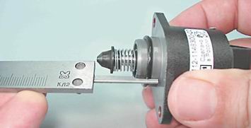 Замечание. Электрическое сопротивление между выводами А-В и C-D должно быть около 53 Ом. Сопротивление между выводами А-С и B-D должно быть большим (стремиться к бесконечности). Неисправный регулятор необходимо заменить. Установка Предупреждение! Перед установкой нового регулятора необходимо убедиться, что игла клапана выступает не более чем на 23 мм. 1. Штангенциркулем с глубиномером измеряем выступание иглы нового клапана.