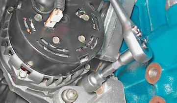 Совет. Если трудно оценить усилие, создаваемое рукой, можно воспользоваться бытовым безменом с максимально допустимой нагрузкой 10 кг. Рекомендация. Правильно отрегулированный ремень должен прогнуться на 6-8 мм. Если прогиб ремня не соответствует норме, отрегулируйте натяжение ремня. 3. Накидным ключом или торцовым ключом на 13 мм с трещоткой ослабляем затяжку гайки болта нижнего крепления генератора.
