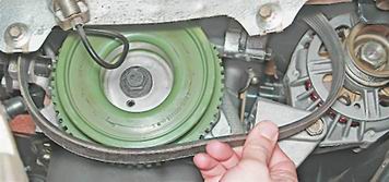 3. Сдвинув генератор к блоку цилиндров двигателя, снимаем ремень со шкива коленчатого вала и со шкива генератора.