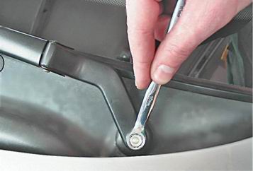 10. Торцовым ключом на 10 мм отворачиваем две гайки правого и левого крепления решетки воздухопритока к кронштейнам кузова.
