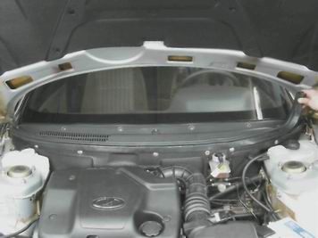 12. Вытягивая шланг омывателя из перегородки моторного отсека, снимаем решетку воздухопритока.