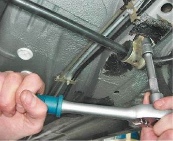 Стабилизатор поперечной устойчивости - снятие, разборка и установкаДля выполнения работы потребуется смотровая яма или эстакада. Снятие 1. Подготавливаем автомобиль к выполнению работы (см. "Подготовка автомобиля к техническому обслуживанию и ремонту"). 2. Отворачиваем гайку болта крепления стойки стабилизатора к нижнему рычагу передней подвески (см. "Стабилизатор поперечной устойчивости - замена стоек") и выбиваем болт из отверстий стойки и рычага. Так же вынимаем болт соединения стойки стабилизатора с правым рычагом подвески. 3. Торцовым ключом на 13 мм с удлинителем отворачиваем две гайки крепления скобы левой подушки штанги стабилизатора к кузову.