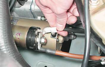 Стартер - снятие и установкаСнятие 1. Подготавливаем автомобиль к выполнению работы и отсоединяем клемму провода от отрицательного вывода аккумуляторной батареи (см. "Подготовка автомобиля к техническому обслуживанию и ремонту"). 2. Снимаем корпус воздушного фильтра (см. "Воздушный фильтр - снятие и установка"). 3. Отсоединяем колодку провода от вывода тягового реле.