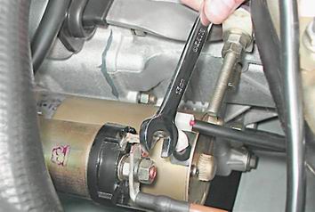 5. Накидным ключом на 15 мм или торцовым ключом с удлинителем отворачиваем две гайки крепления стартера (доступ к нижней гайке затруднен).