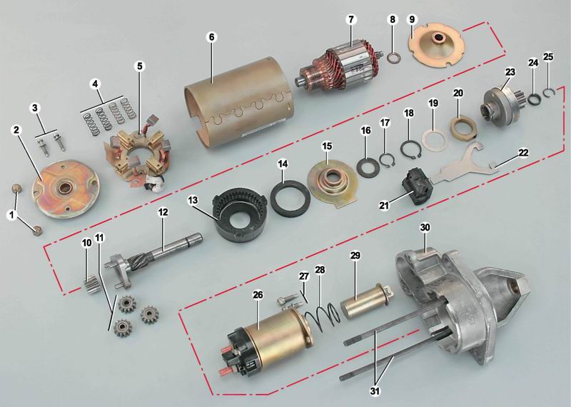 Детали стартера: 1 - гайки крепления задней крышки; 2 - задняя крышка; 3 - винты крепления щеточного узла; 4 - пружины щеток; 5 - щеточный узел; 6 - статор (с магнитами); 7 - якорь; 8 - упорная шайба; 9 - опора вала якоря; 10 - центральная шестерня редуктора; 11 - планетарные (сателлитные) шестерни редуктора; 12 - вал привода; 13 - внешняя шестерня редуктора с внутренними зубьями; 14 - уплотнительное кольцо; 15 - опора вала привода; 16 - упорная шайба; 17 - стопорное кольцо вала привода; 18 - стопорное кольцо муфты рычага привода; 19 - шайба; 20 - муфта рычага привода; 21 - опора рычага привода; 22 - рычаг привода; 23 - привод; 24 - кольцо ограничения хода привода; 25 запорное кольцо ограничителя; 26 - тяговое реле стартера; 27 - винты крепления тягового реле; 28 - возвратная пружина; 29 - сердечник тягового реле; 30 - передняя крышка; 31 - стяжные шпилькиВал якоря двигателя и вал привода вращаются в бронзографитовых втулках, которые установлены в задней и передней крышках стартера, в опоре вала якоря и в опоре вала привода. Вал якоря передает вращение на вал привода через планетарный редуктор. Планетарные шестерни редуктора вращаются на игольчатых подшипниках. Привод стартера состоит из ведущей шестерни и обгонной муфты. Привод может передвигаться по спиральным шлицам вала привода. Тяговое реле предназначено для дистанционного коммутирования большого тока, потребляемого стартером при запуске двигателя, а также механического соединения привода стартера с зубчатым венцом маховика двигателя. Катушка реле имеет две обмотки, втягивающую и удерживающую. При повороте ключа зажигания в положение "стартер" на управляющий вывод тягового реле "50", а с него на обе обмотки реле от аккумуляторной батареи подается напряжение. Под воздействием магнитного поля металлический сердечник тягового реле, преодолевая усилие возвратной пружины, втягивается внутрь катушки. При этом он приводит в движение рычаг привода стартера. Рычаг привода своей подковообразной вилкой выдвигает привод стартера, вводя ведущую шестерню в зацепление с зубчатым венцом маховика двигателя. Одновременно с этим медная контактная пластина, расположенная в пластмассовой крышке тягового реле, замыкает контактные болты. Через обмотки якоря стартера начинает протекать ток, и якорь вращается, осуществляя запуск двигателя. Отрицательный вывод втягивающей обмотки реле соединен с "массой" через обмотки якоря стартера (см. схему). После замыкания контактных болтов через эту обмотку перестает протекать ток и сердечник тягового реле удерживается только одной обмоткой. Это позволяет уменьшить нагрев обмоток реле и сократить расход электроэнергии в момент запуска двигателя. Обгонная роликовая муфта привода передает вращение только в одну сторону - от стартера на маховик. После запуска двигателя, когда обороты коленчатого вала резко возрастают, муфта предохраняет стартер от разрушения.