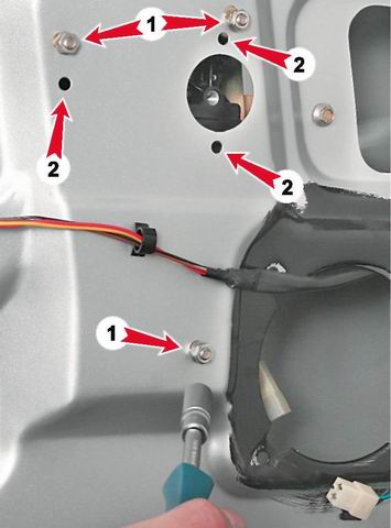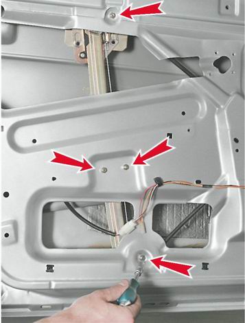 Замечание. Механизм стеклоподъемника с механическим приводом крепится на трех шпильках с гайками на 10 мм. Отверстия под шпильки обозначены на фотографии (см выше поз. 2). 7. Тем же ключом отворачиваем четыре гайки крепления направляющей стеклоподъемника.