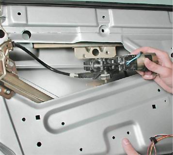 Стеклоподъемник передней двери - снятие и установкаЗамечание. Работа показана на примере стеклоподъемника с электроприводом. Особенности снятия и установки стеклоподъемника с механическим приводом указаны в тексте. Снятие 1. Снимаем внутреннюю обивку двери (см. "Обивка передней двери - снятие и установка"). 2. Снимаем полиэтиленовую пленку с двери. 3. Включив зажигание, опускаем стекло двери до уровня, позволяющего открутить два болта крепления кронштейна стекла к стеклоподъемнику (см. ниже п. 5). Разъединяем колодки проводов мотор-редуктора стеклоподъемника.