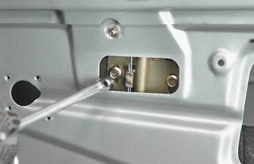 4. Надев ручку стеклоподъемника на вал механизма привода, опускаем стекло, так чтобы болты крепления кронштейна стекла совпали с проемом во внутренней панели двери. Торцовым ключом на 10 мм с удлинителем ослабляем затяжку болтов крепления кронштейна стекла к направляющей стеклоподъемника. Затем, придерживая стекло, полностью отворачиваем болты крепления стекла, после чего опускаем стекло вниз.