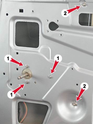 5. Вращая ручку, перемещаем подвижную пластину направляющей стеклоподъемника вниз до упора. Снимаем ручку стеклоподъемника с вала привода. 6. Торцовым ключом на 8 мм отворачиваем три гайки крепления механизма привода стеклоподъемника (1). Торцовым ключом на 10 мм отворачиваем две гайки крепления направляющей стеклоподъемника (2).
