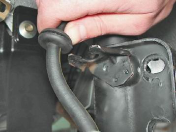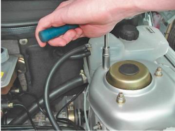 Стойка передней подвески - снятие и установкаДля выполнения работы потребуется надежная подставка под автомобиль. Снятие 1. Подготавливаем автомобиль к выполнению работы (см. "Подготовка автомобиля к техническому обслуживанию и ремонту"). 2. Снимаем переднее колесо (см. "Колесо - замена"). 3. Отсоединяем наконечник рулевой тяги от поворотного кулака стойки (см. "Наконечник рулевой тяги - снятие и установка"). 4. Торцовым ключом на 13 мм с глубокой головкой отворачиваем три гайки крепления верхней опоры стойки к кузову автомобиля.