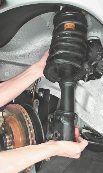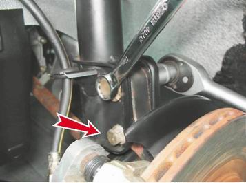 6. Ключом на 19 мм отворачиваем гайки болтов верхнего и нижнего крепления поворотного кулака к стойке, удерживая болты от проворачивания ключом на 17 мм.