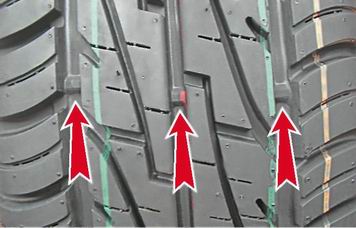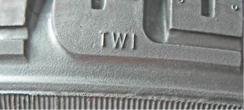 Выступы имеют высоту 1,6 мм. Как только высота протектора сравняется с высотой выступа, шина подлежит замене. Индикаторы расположены по всей окружности шины на некотором расстоянии друг от друга. Находим их по условным обозначениям в виде букв "TWI" или стрелкам "▲" на боковине шины.