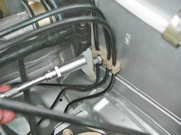 5. Торцовым ключом на 10 мм отворачиваем гайку крепления держателя тормозных трубок на левом брызговике.