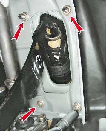 8. Торцовым ключом на 13 мм отворачиваем четыре гайки крепления кронштейна усилителя к кузову автомобиля.