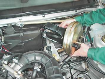 Вакуумный усилитель тормозов - снятие и установкаСнятие 1. Подготавливаем автомобиль к выполнению работы (см. "Подготовка автомобиля к техническому обслуживанию и ремонту"). 2. Снимаем правую и левую части обивки моторного отсека (см. "Обивка моторного отсека - снятие и установка"). 3. Отворачиваем две гайки крепления главного тормозного цилиндра к корпусу вакуумного усилителя (см. выше "Главный тормозной цилиндр - снятие и установка"). 4. Снимаем шланг подвода разрежения с патрубка обратного клапана усилителя.