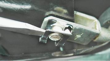 10. Закрепляем кронштейн усилителя в тисках. 11. Шлицевой отверткой снимаем фиксирующую скобу пальца вилки штока усилителя.