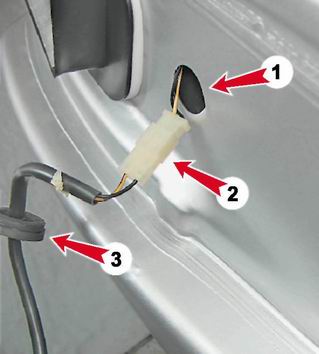 4. Вынимаем резиновую заглушку (3) из задней панели кузова (1), вытягиваем наружу колодку жгута проводов (2). Разъединяем колодки.