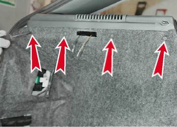 При снятии левого фонаря снимаем плафон освещения багажного отделения (см. "Плафон освещения багажного отделения - снятие и установка, замена лампы"). 3. Отворачиваем шесть саморезов крепления верхнего края обивки боковины багажника (один саморез ввернут в пластмассовую облицовку задней панели) и отодвигаем верхнюю часть обивки багажного отделения.