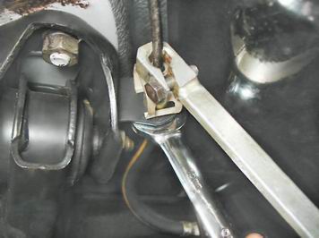 4. Окончательно отворачиваем штуцер рожковым ключом на 10 мм. 5. Для предотвращения утечки тормозной жидкости надеваем на конец тормозной трубки защитный колпачок штуцера прокачки рабочего цилиндра. 6. Выводим верхний наконечник тормозного шланга из отверстия кронштейна кузова. 7. Аналогичным образом отворачиваем трубку от нижнего наконечника тормозного шланга и освобождаем его, выводя из отверстия кронштейна установленного на балке заднего моста.