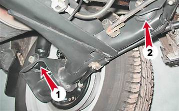 Задняя подвеска - проверка технического состоянияПроверку технического состояния необходимо выполнять в соответствии с регламентом периодического технического обслуживания (см. "Периодическое техническое обслуживание"). Оценить техническое состояние подвески можно во время движения автомобиля. При движении на небольшой скорости по неровной дороге подвеска должна работать без стуков, скрипов и других посторонних звуков. После переезда через препятствие автомобиль не должен раскачиваться. Совет. Проверку подвески лучше совместить с проверкой состояния шин и подшипников ступиц колес (см. "Ступицы, диски и шины - проверка технического состояния"). Односторонний износ протектора шины свидетельствует о деформации балки задней подвески. Для выполнения работы потребуется смотровая яма или эстакада. Последовательность выполнения 1. Подготавливаем автомобиль к выполнению работы (см. "Подготовка автомобиля к техническому обслуживанию и ремонту"). Рекомендация. Проверять работоспособность амортизаторов лучше после продолжительной поездки, пока рабочая жидкость в амортизаторах не остыла. 2. Энергично раскачиваем заднюю часть кузова автомобиля в вертикальном направлении. Если по инерции кузов продолжает совершать колебания (более двух: вверх-вниз), после того как его перестали раскачивать, то неисправен один или оба амортизатора. Чтобы выявить неисправный амортизатор, повторяем проверку, прикладывая усилия сначала с одной стороны, а затем с другой автомобиля. Замечание. Такая проверка позволяет выявить только неисправные амортизаторы. Проверить эффективность гашения колебаний амортизаторами можно только на специальном стенде. 3. Осматриваем амортизаторы подвески - подтекание жидкости из амортизаторов не допускается. Рекомендация. Амортизаторы следует заменять парой, даже если второй амортизатор задней подвески исправен. 4. Визуально проверяем состояние резинометаллических шарниров рычагов балки задней подвески (2) и крепления амортизаторов (1).