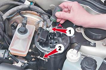 3. Крестовой отверткой ослабляем хомут (1) и снимаем шланг с патрубка адсорбера. Торцовым ключом на 10 мм ослабляем затяжку хомута (2) крепления адсорбера.
