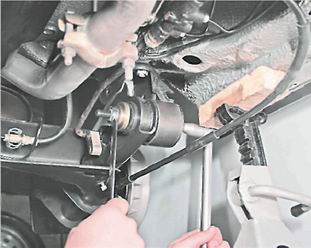 6. Вынимаем болт. Оттягиваем рычаг вниз (не натягивая тормозной шланг) и устанавливаем чашку съемника с наружной стороны, а специальную шайбу с внутренней стороны рычага. 7. Вращая гайку болта съемника, выпрессовываем сайлент-блок в чашку.
