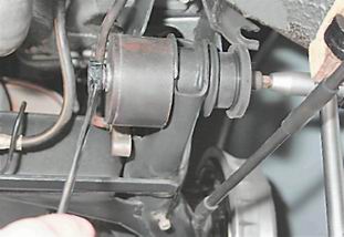 Балка задней подвески - замена сайлент-блокаДля замены сайлент-блока снятие балки с автомобиля не требуется. Сайлент-блоки меняем по очереди, сначала у одного, затем у другого рычага балки. Для выполнения работы потребуются: - подставка под автомобиль; - универсальный чашечный съемник. Снятие 1. Подготавливаем автомобиль к выполнению работ (см. "Подготовка автомобиля к техническому обслуживанию и ремонту"). 2. Устанавливаем автомобиль на надежную подставку и снимаем заднее левое колесо (см. "Колесо - замена"). 3. Отсоединяем упругий рычаг регулятора давления от серьги (см. "Регулятор давления жидкости в задних тормозных механизмах - снятие и установка"). 4. Освобождаем левый трос стояночного тормоза из двух кронштейнов крепления троса к левому рычагу задней подвески (см. "Тросы стояночного тормоза - снятие и установка"). 5. Торцовым ключом на 19 мм отворачиваем гайку болта крепления рычага к кронштейну кузова, удерживая болт накидным ключом на 19 мм.