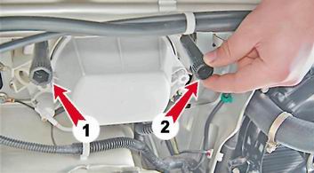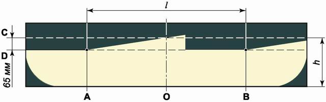 Схема разметки экрана для регулировки света блок-фар: А - вертикальная линия, обозначающая расположение лампы ближнего/дальнего света левой блок-фары; В - вертикальная линия, обозначающая расположение лампы ближнего/дальнего света правой блок-фары; С - горизонтальная линия, обозначающая расположение ламп ближнего/дальнего света фар; D - линия, обозначающая высоту подъема горизонтальной границы пучков света; О - осевая линия; / = 964 мм - расстояние между лампами ближнего/дальнего света блок-фар; h - расстояние от поверхности площадки на которой установлен автомобиль до ламп ближнего/дальнего света фар Замечание: Необходимые замеры можно сделать с помощью рулетки. 3. Проверяем давление в шинах, при необходимости доводим его до нормы. 4. Поворачиваем ручку привода гидрокорректора фар в положение, соответствующее минимальной загрузке автомобиля. 5. Усаживаем помощника на сиденье водителя. После чего энергично качаем автомобиль сбоку для самоустановки подвески. 6. Включив ближний свет фар, закрываем листом картона одну из блок-фар, например, правую. 7. Вращая рукоятку регулировочного винта (1) левой блок-фары, подводим горизонтальную границу пучка света к линии С, а затем, вращая регулировочный винт (2), совмещаем излом границы пучка света с линией А.