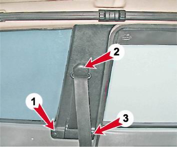 ...и, сместив вверх, снимаем накладку. На автомобиле ВАЗ-2113 ключом на 17 мм отворачиваем болт крепления ремня безопасности (2). Крестовой отверткой отворачиваем саморез (3) и вынимаем фиксатор (1) крепления накладки средней стойки кузова.