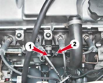 2. Нажав на фиксатор, отсоединяем колодку жгута проводов (2) от датчика детонации. Торцовым ключом на 13 мм отворачиваем болт крепления датчика к блоку цилиндров.