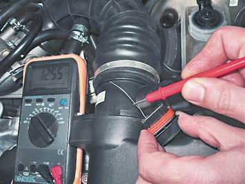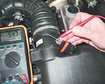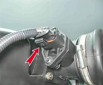 Датчик массового расхода воздуха - проверка и заменаДля выполнения работы потребуется: мультиметр (в режиме вольтметра). Проверка 1. Подготавливаем автомобиль к выполнению работы (см. "Подготовка автомобиля к техническому обслуживанию и ремонту"). 2. Нажимаем на фиксатор колодки и отсоединяем колодку жгута проводов от датчика массового расхода воздуха.