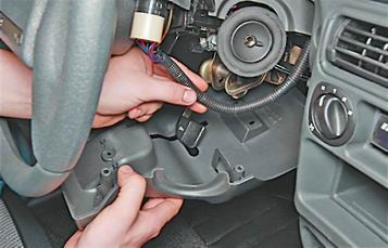 3. Перемещаем рычаг фиксации рулевой колонки вниз до упора и опускаем рулевую колонку. 4. Снимаем нижнюю накладку и отсоединяем от нее жгут проводов выключателя аварийной сигнализации.