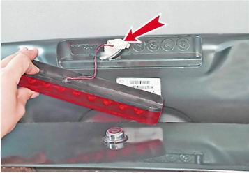 3. Отводим фонарь, вытягивая жгут проводов из спойлера, разъединяем колодку и снимаем фонарь дополнительного сигнала торможения с автомобиля.