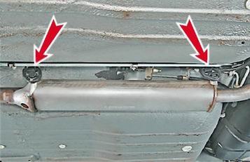 Совет: Если не удается отвернуть гайки, распилите болты крепления фланцев ножовочным полотном. 4. Снимаем подушки подвески с кронштейнов дополнительного глушителя...