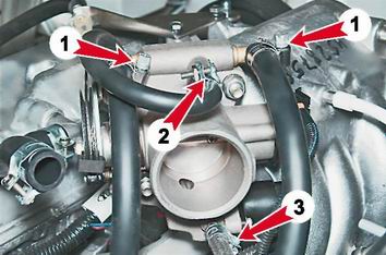 Дроссельный узел - снятие и установкаСовет: Дроссельный узел можно снять, не сливая охлаждающую жидкость. Для этого потребуются два болта М12 любой длины. Предупреждение! Приступать к выполнению работы следует только после остывания двигателя до безопасной температуры (не выше 45°С). Снятие 1. Подготавливаем автомобиль к выполнению ремонта (см. "Подготовка автомобиля к техническому обслуживанию и ремонту"). С двигателя 11183 (1,6i) снимаем декоративную накладку (см. "Декоративная накладка двигателя 11183 (1,6i) - снятие и установка"). 2. Отвернув пробку расширительного бачка, сбрасываем избыточное давление из системы охлаждения двигателя. 3. Снимаем шланг подвода воздуха к дроссельной заслонке (см. "Дроссельная заслонка - регулировка привода"). 4. Отсоединяем от сектора трос привода дроссельной заслонки (см. "Дроссельная заслонка - замена троса привода") 5. Отсоединяем колодку жгута проводов от датчика положения дроссельной заслонки (см. "Датчик положения дроссельной заслонки - проверка и замена"). 6. Отсоединяем колодку проводов от регулятора холостого хода (см. "Регулятор холостого хода - проверка и замена"). 7. Крестовой отверткой ослабляем затяжку хомутов крепления двух шлангов подвода охлаждающей жидкости (1), шланга системы вентиляции картера (2) и шланга адсорбера (3).